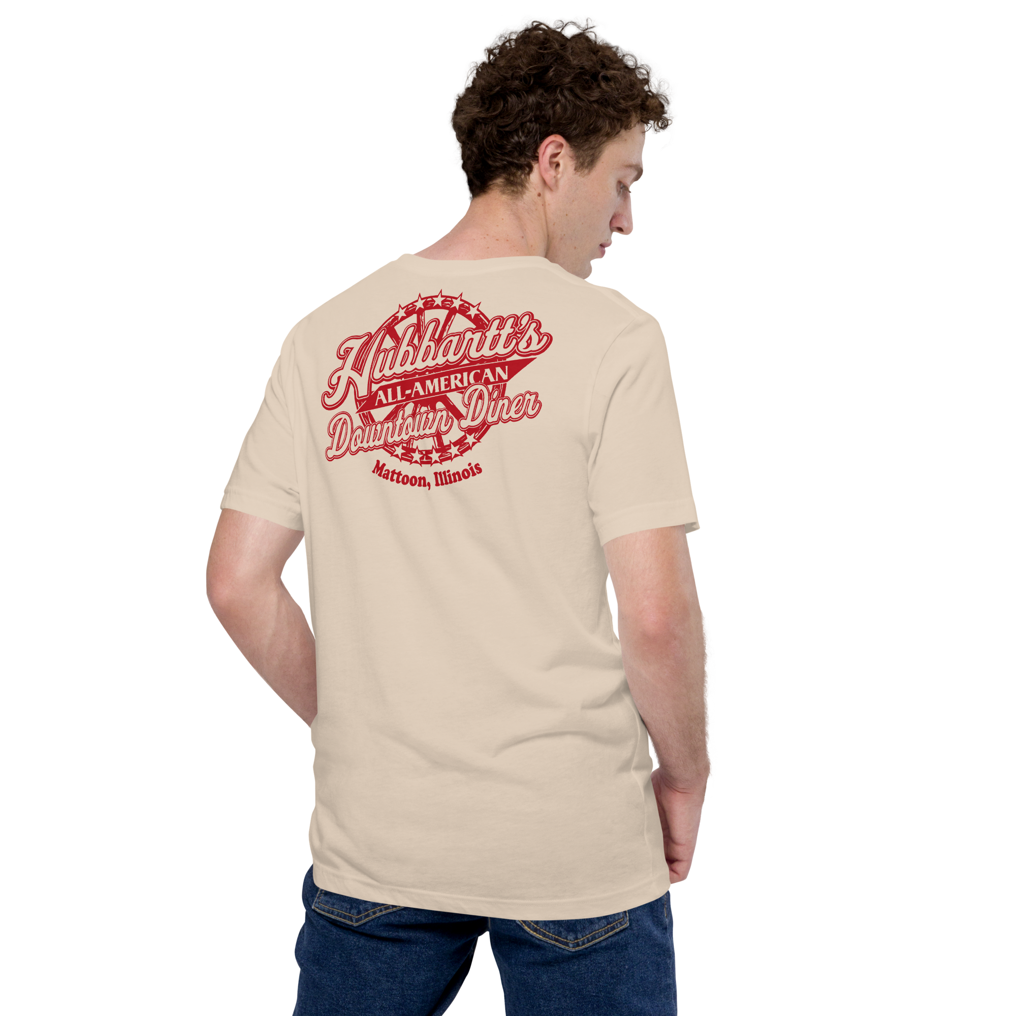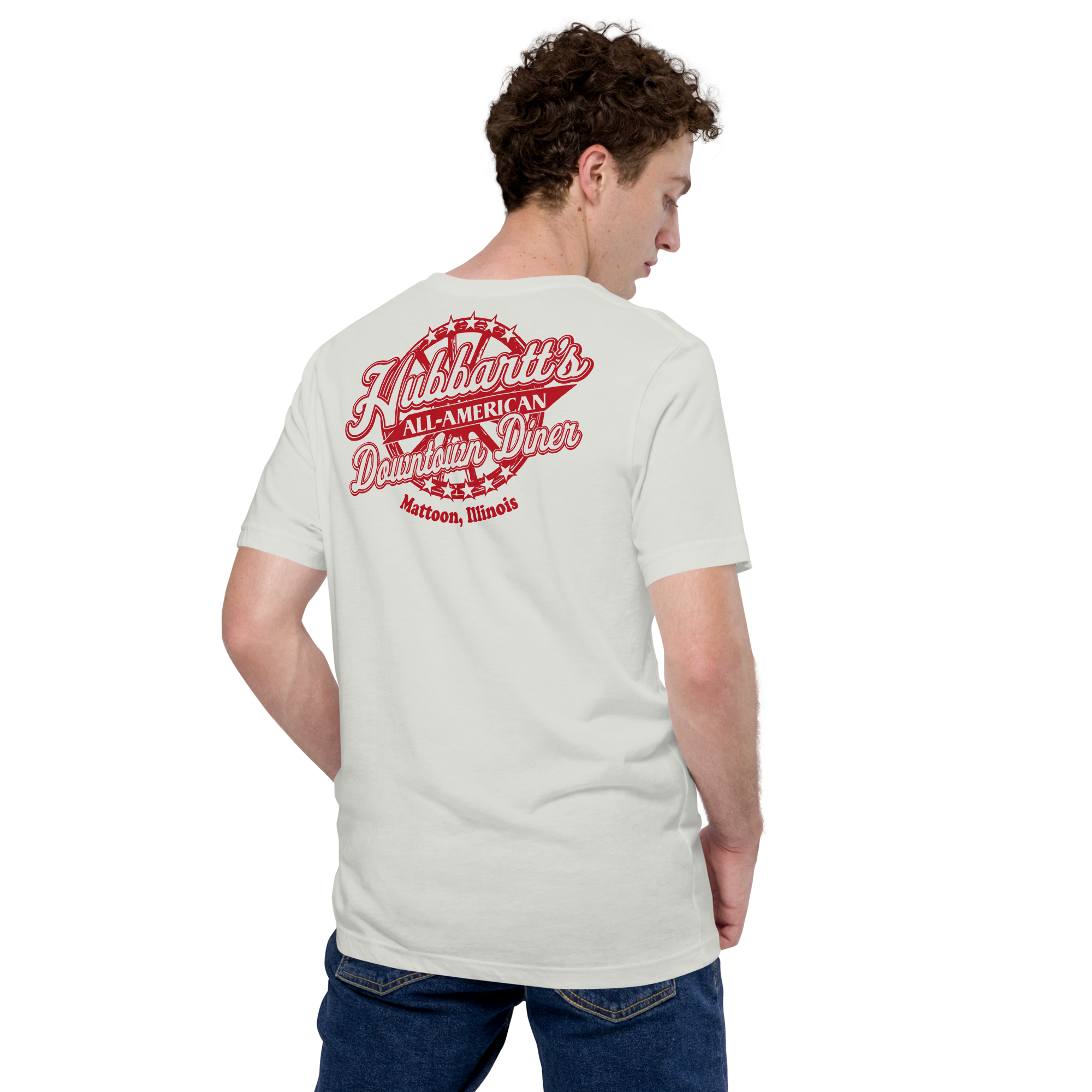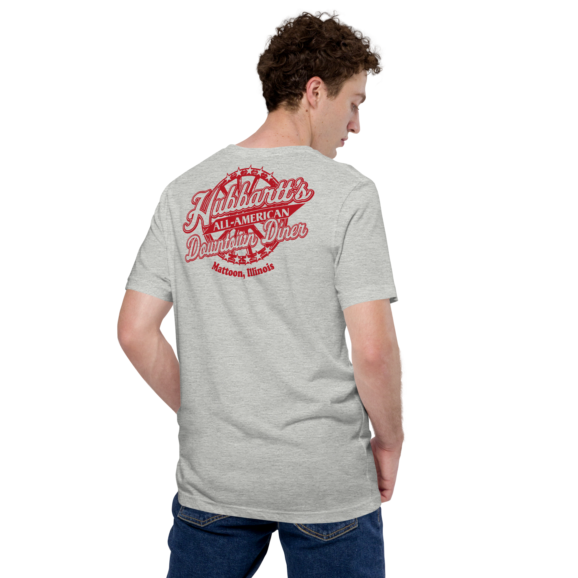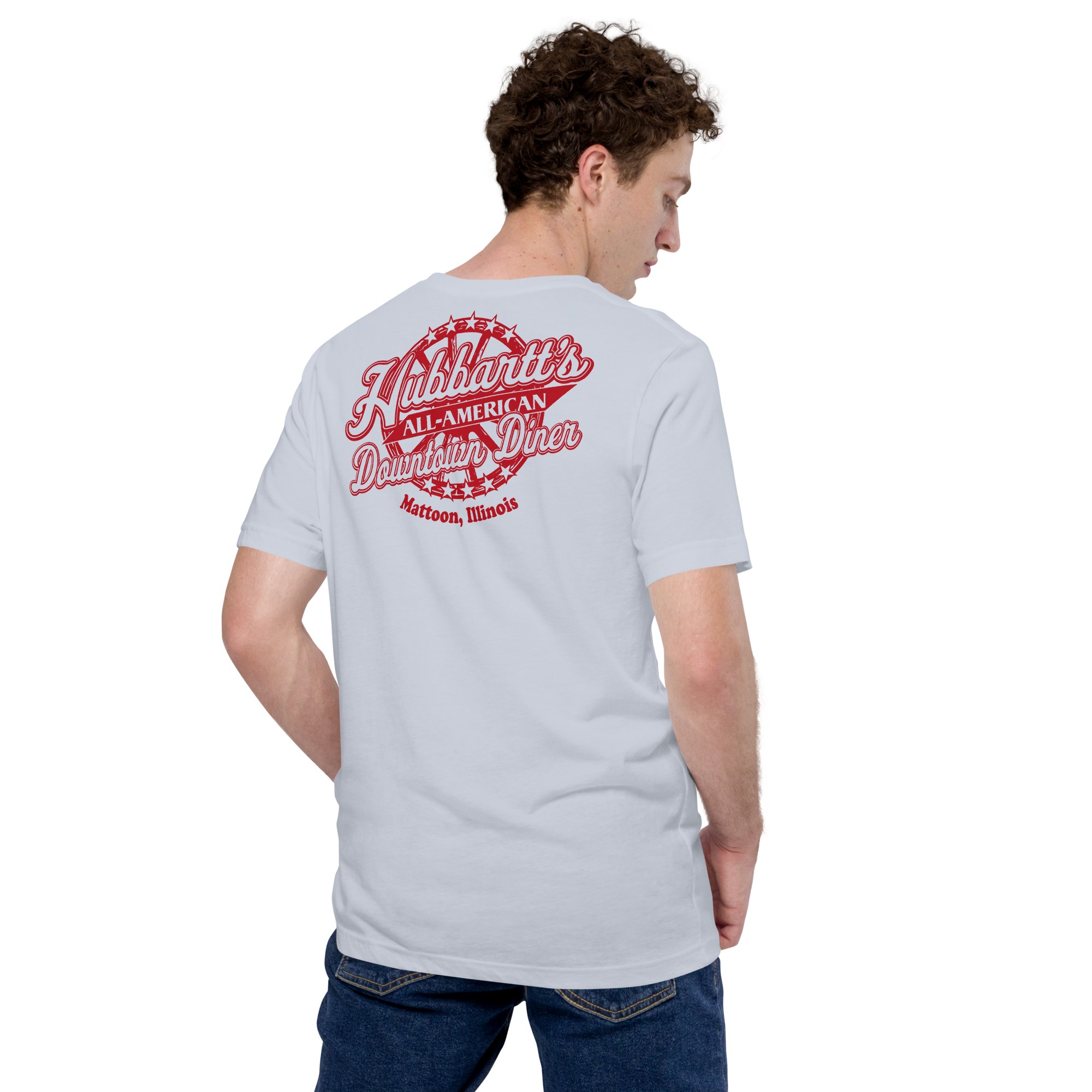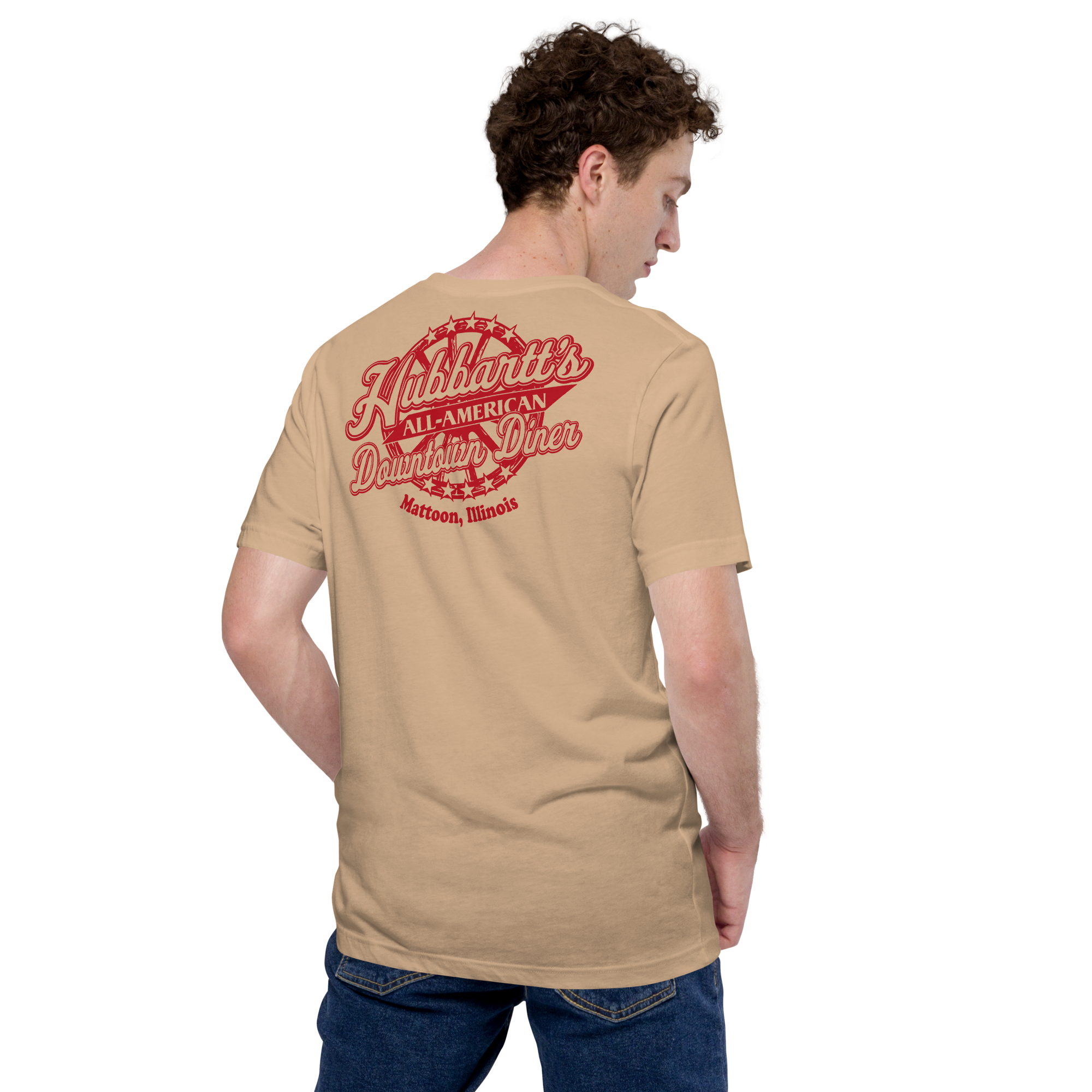 Unisex Staple T-Shirt - 12 Colors, 9 Sizes, Red Front & Back Logo - From Hubbartt's Downtown Diner at the Monarch Shoppe