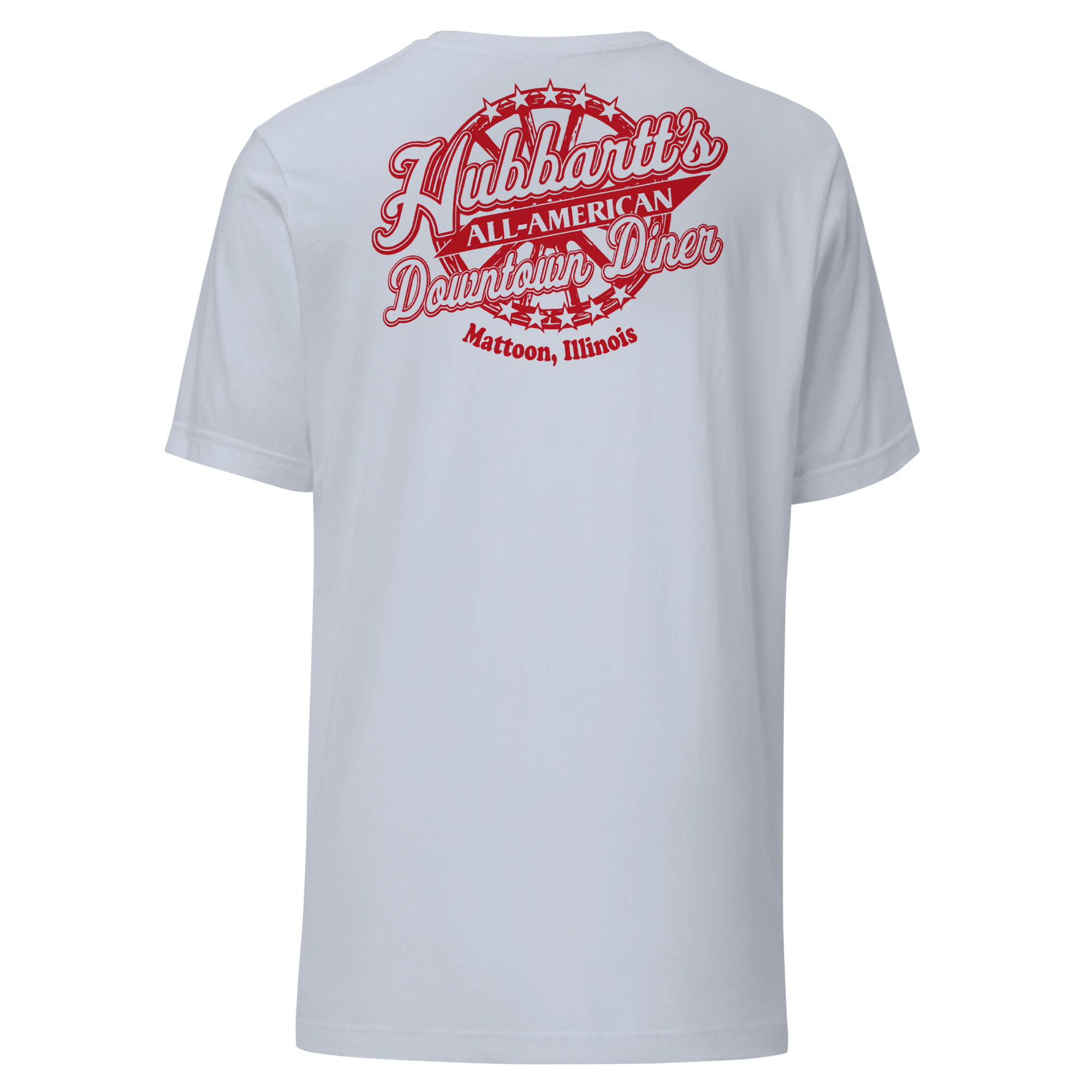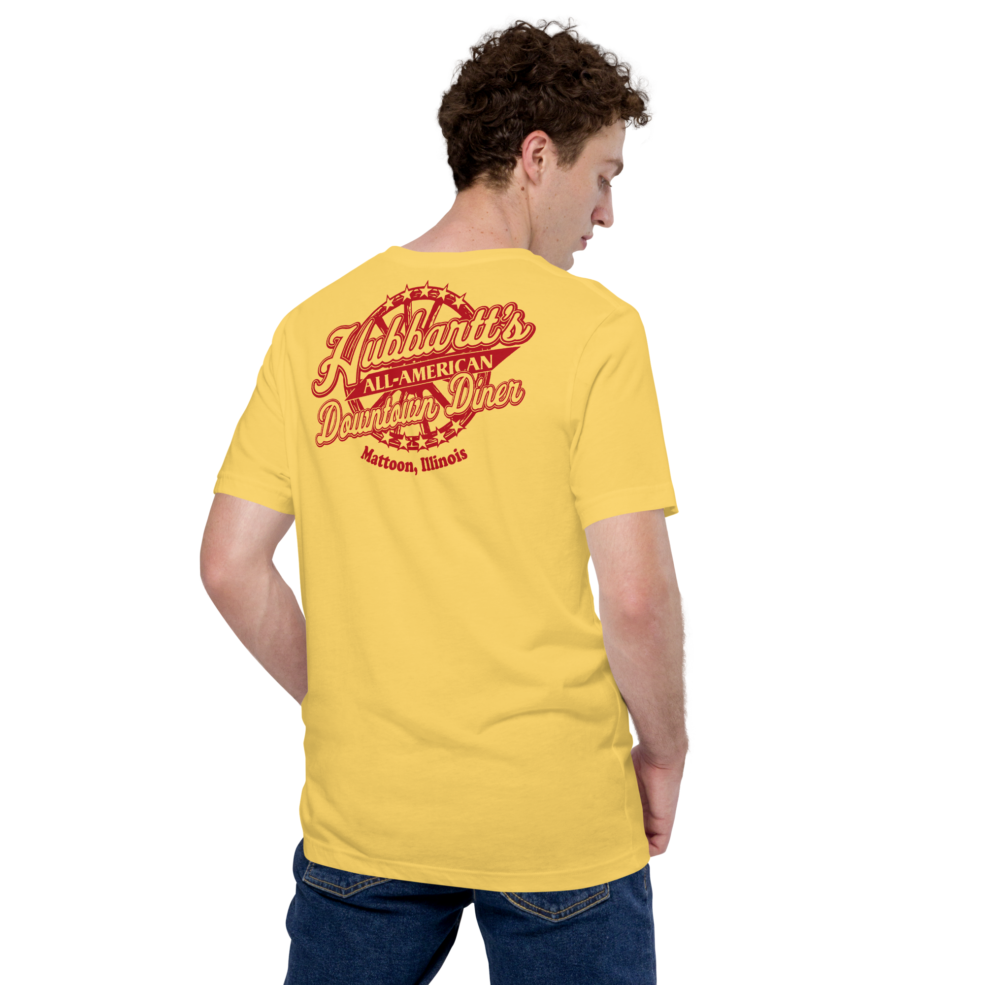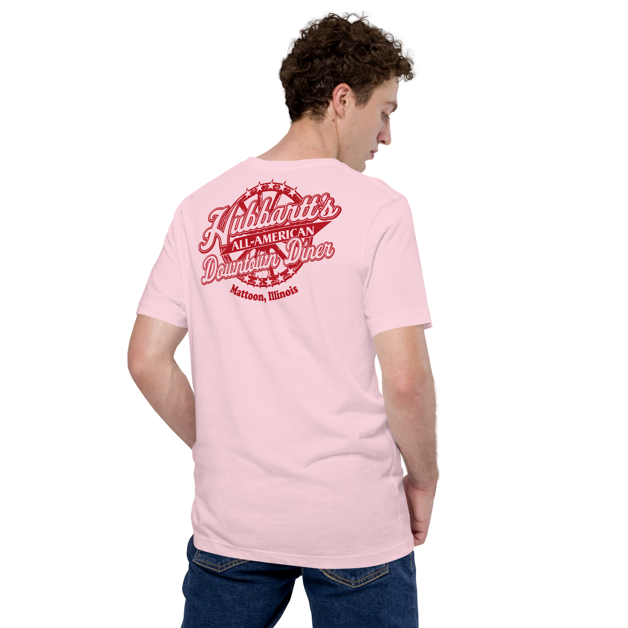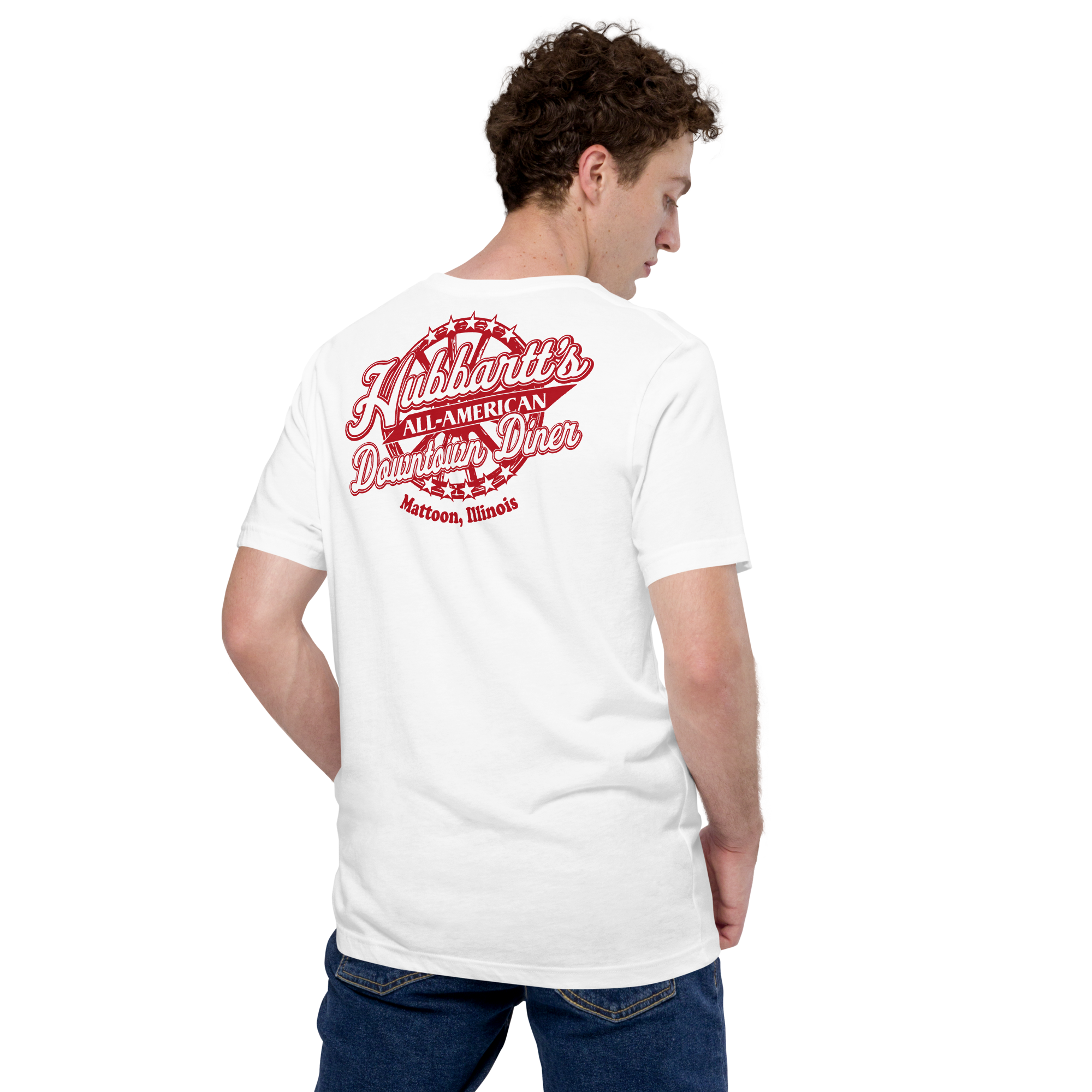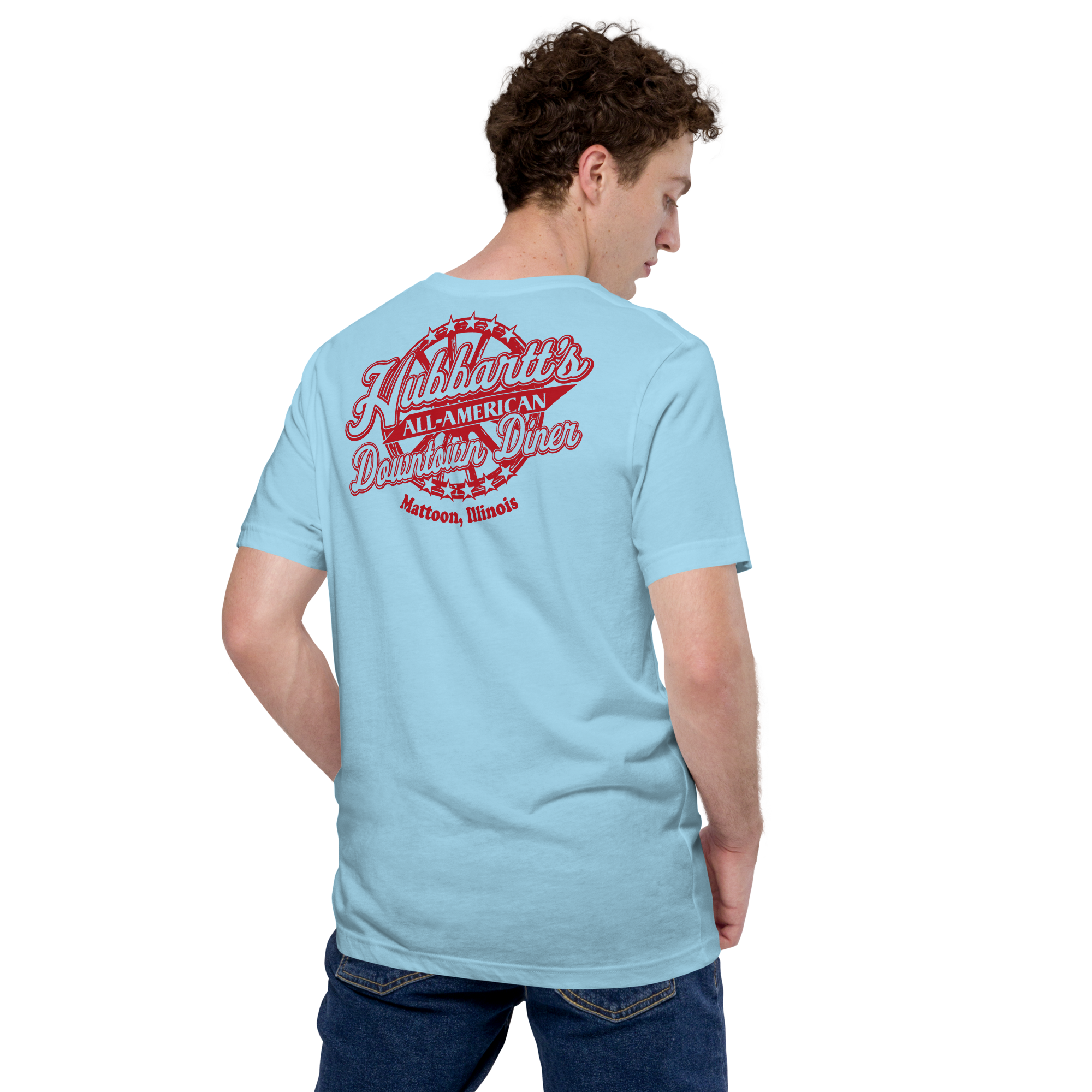 Unisex Staple T-Shirt - 12 Colors, 9 Sizes, Red Front & Back Logo - From Hubbartt's Downtown Diner at the Monarch Shoppe