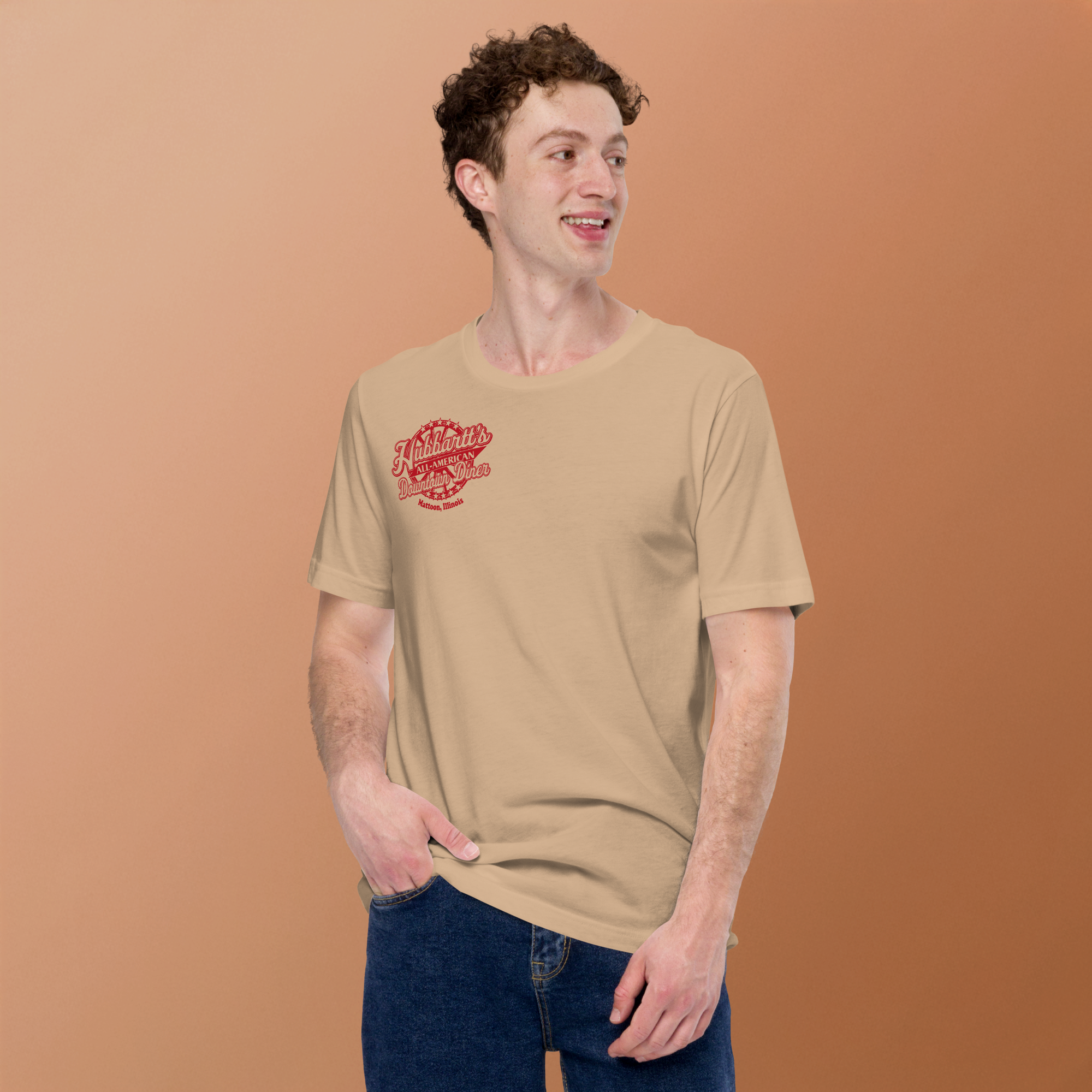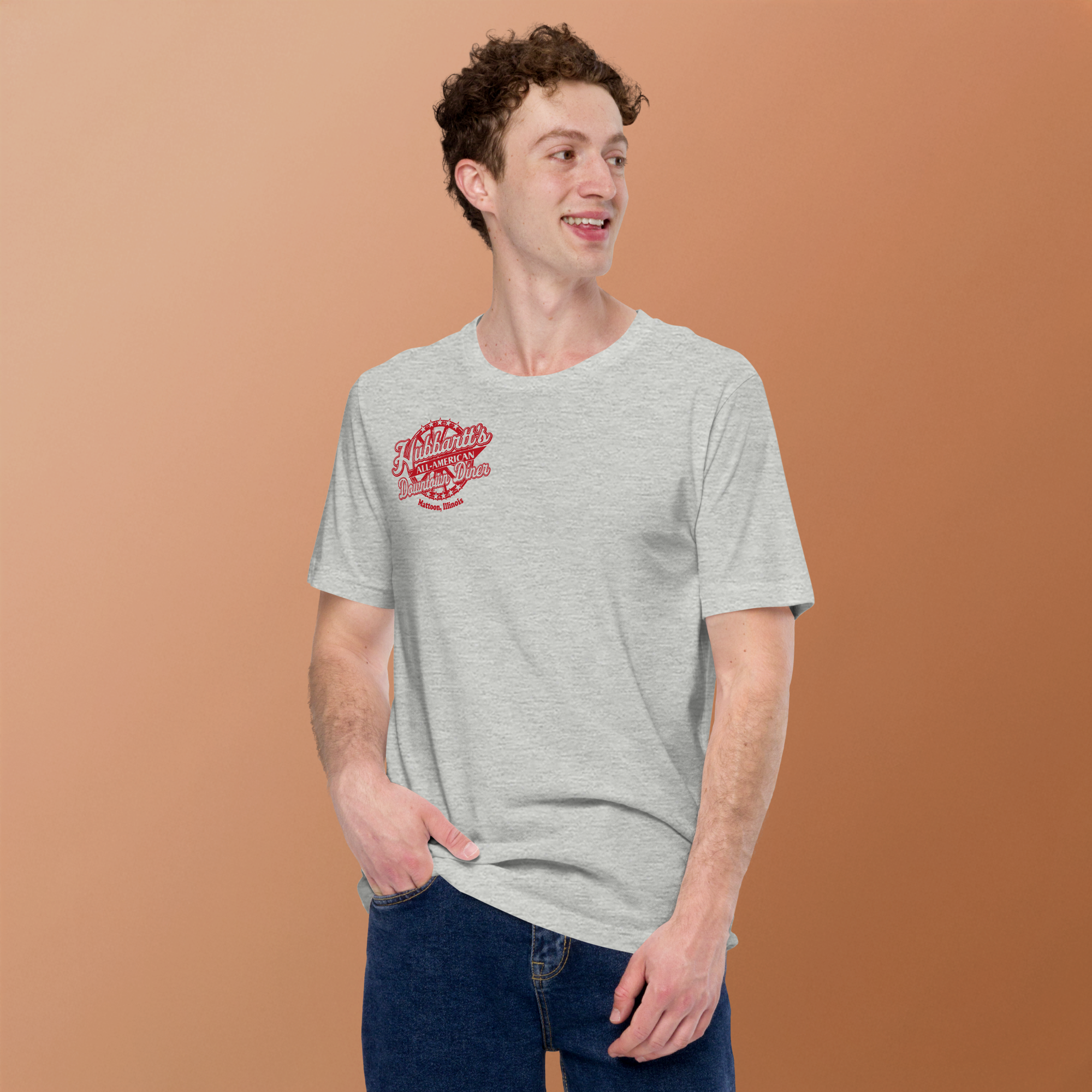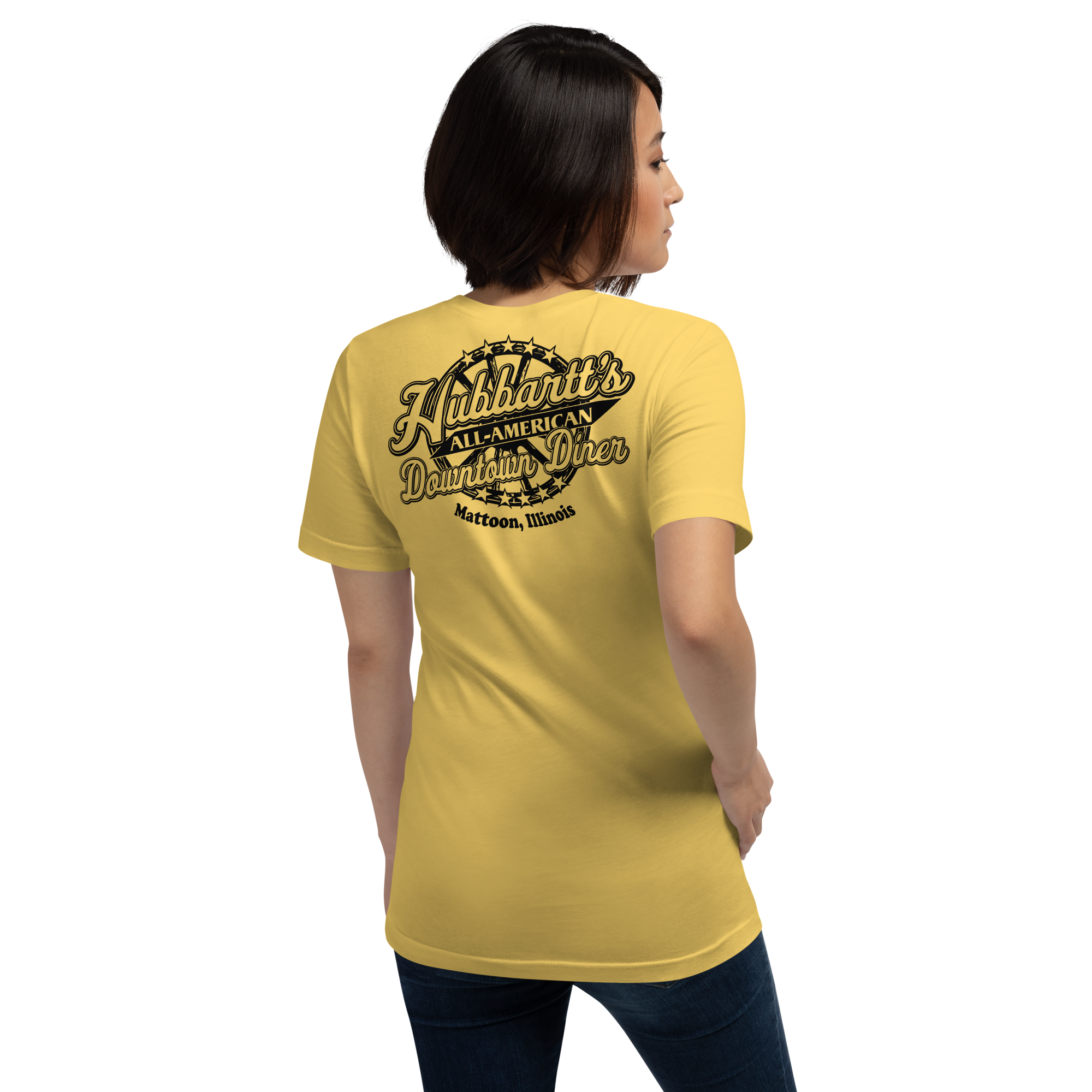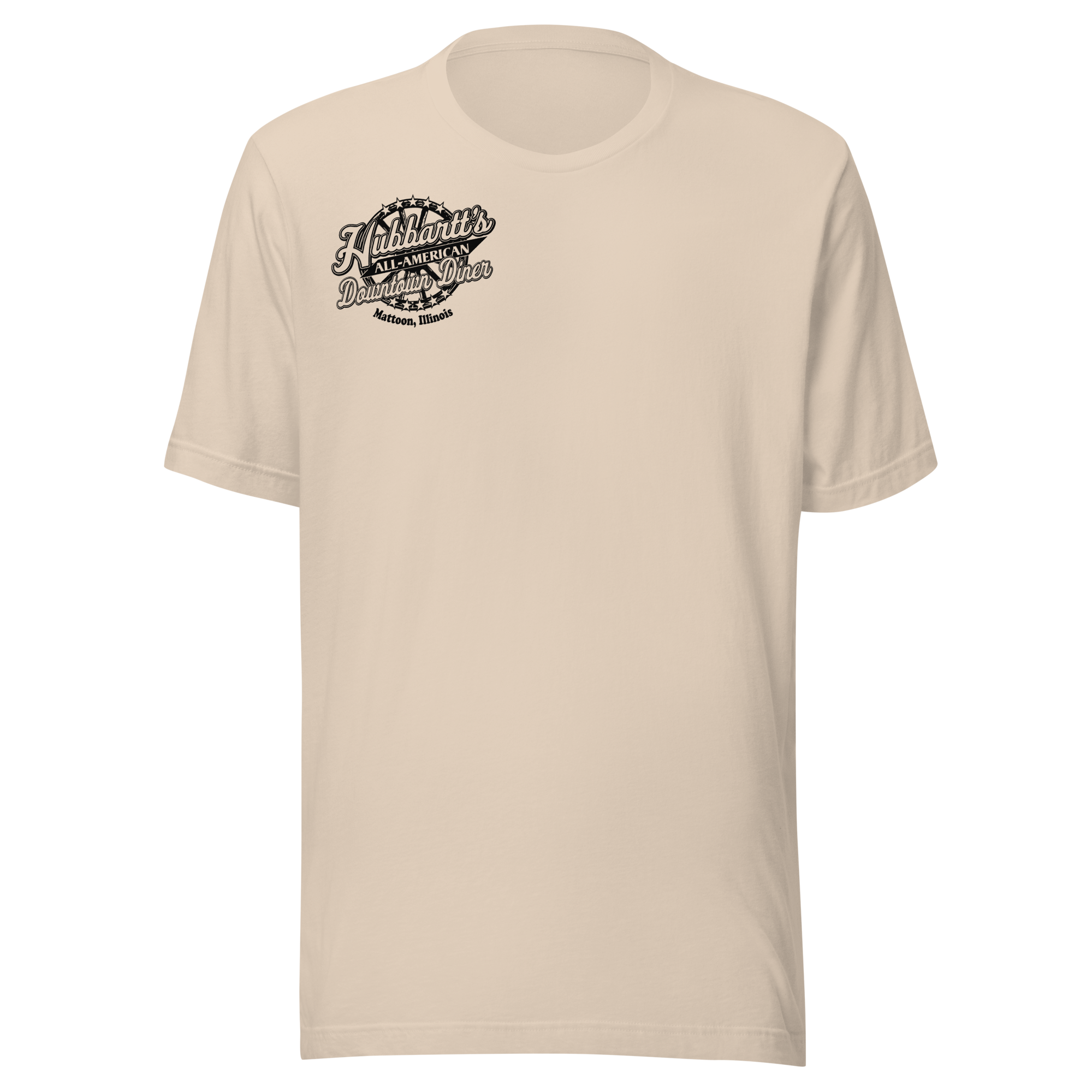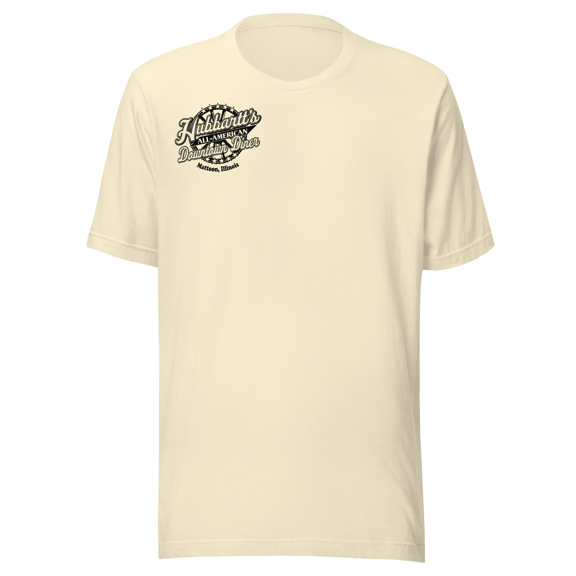 Unisex Staple T-Shirt - 12 Colors, 9 Sizes, Red Front & Back Logo - From Hubbartt's Downtown Diner at the Monarch Shoppe