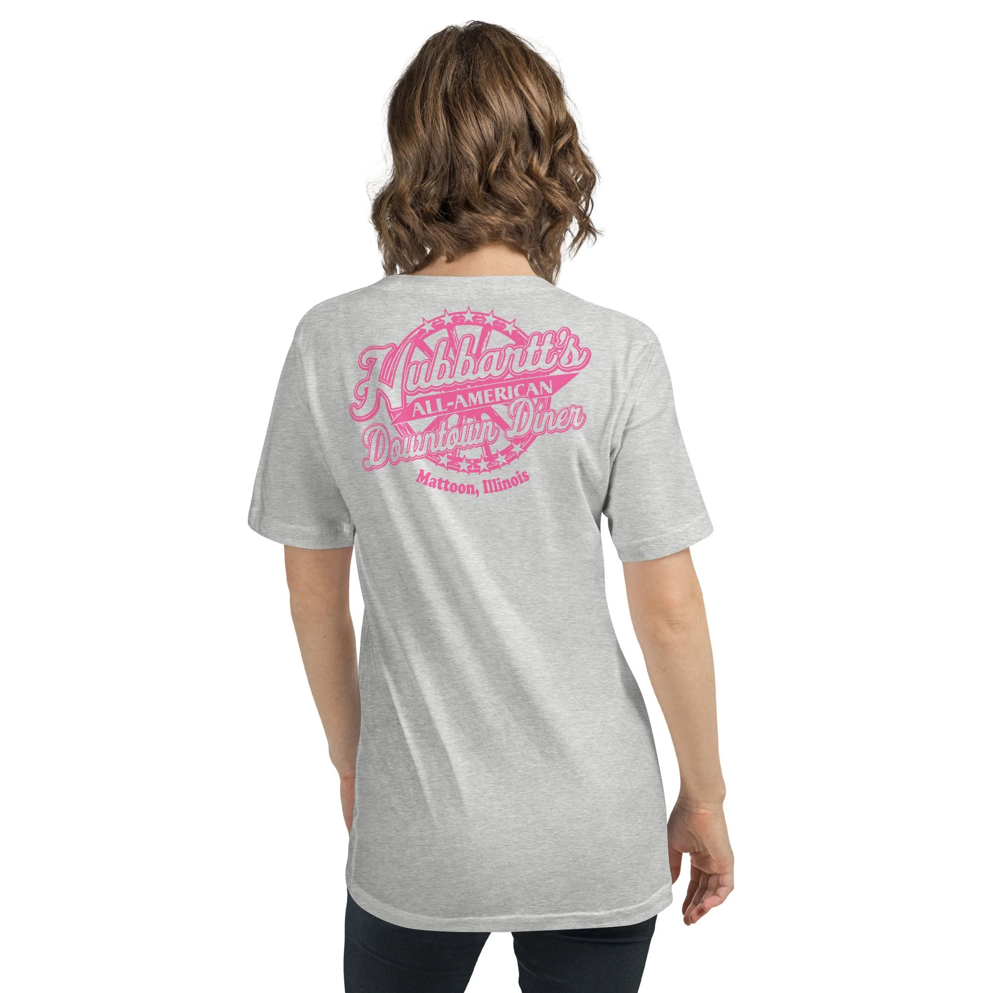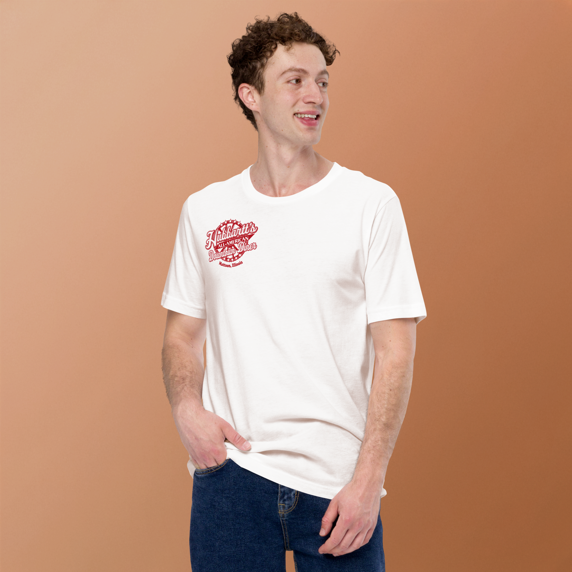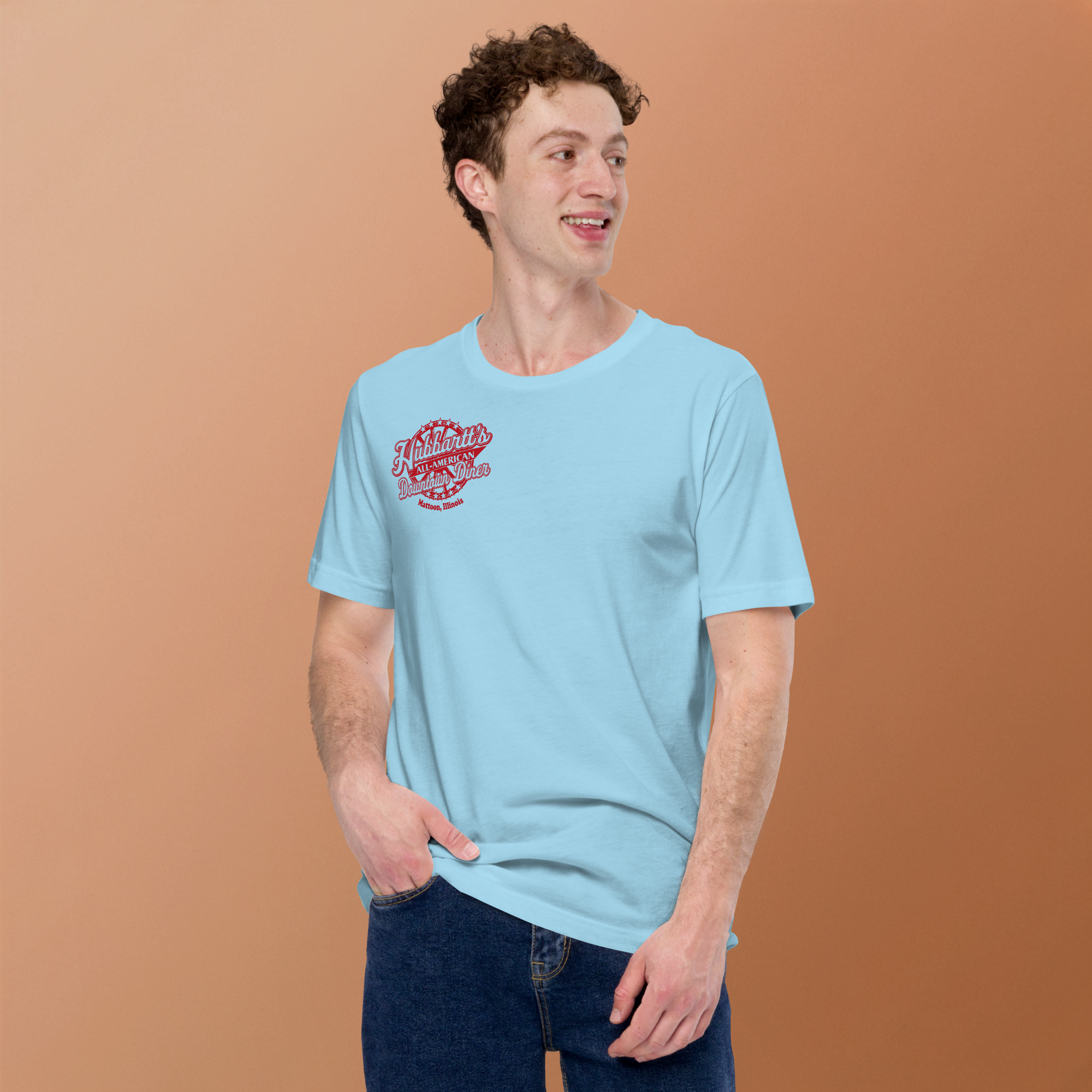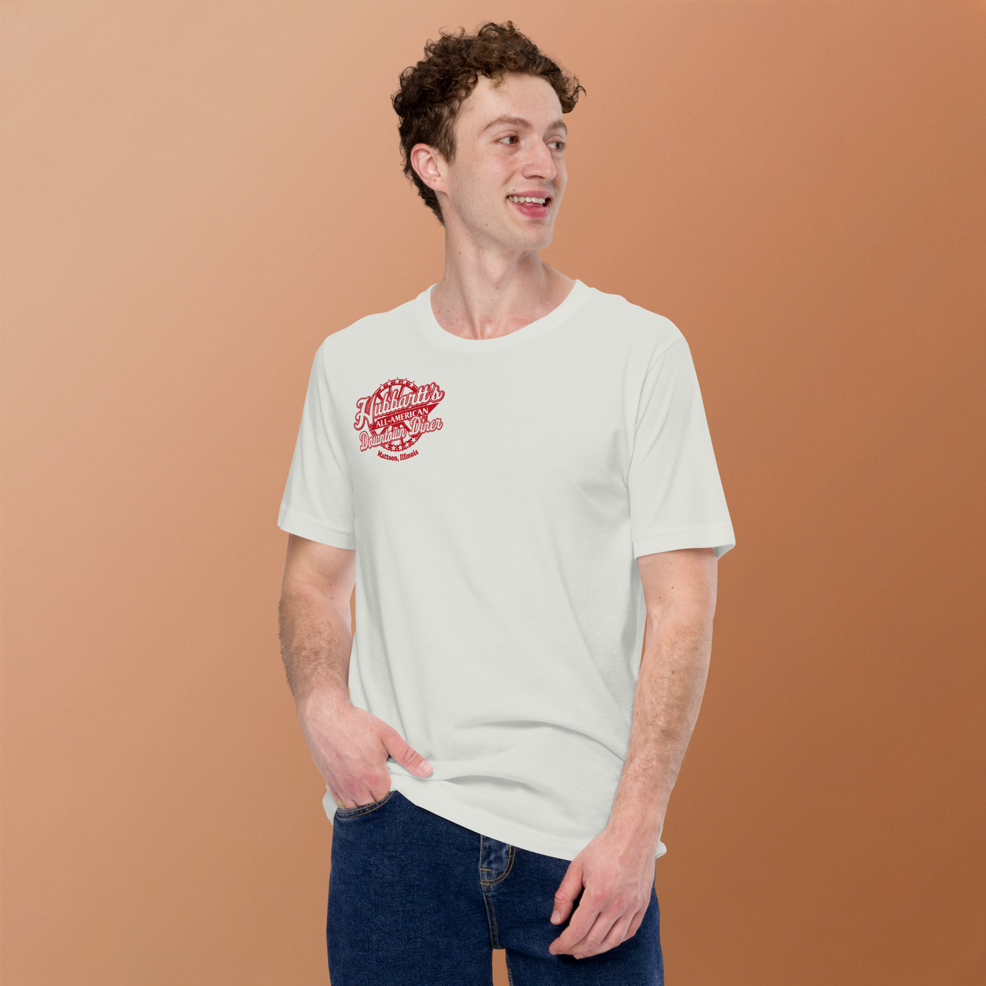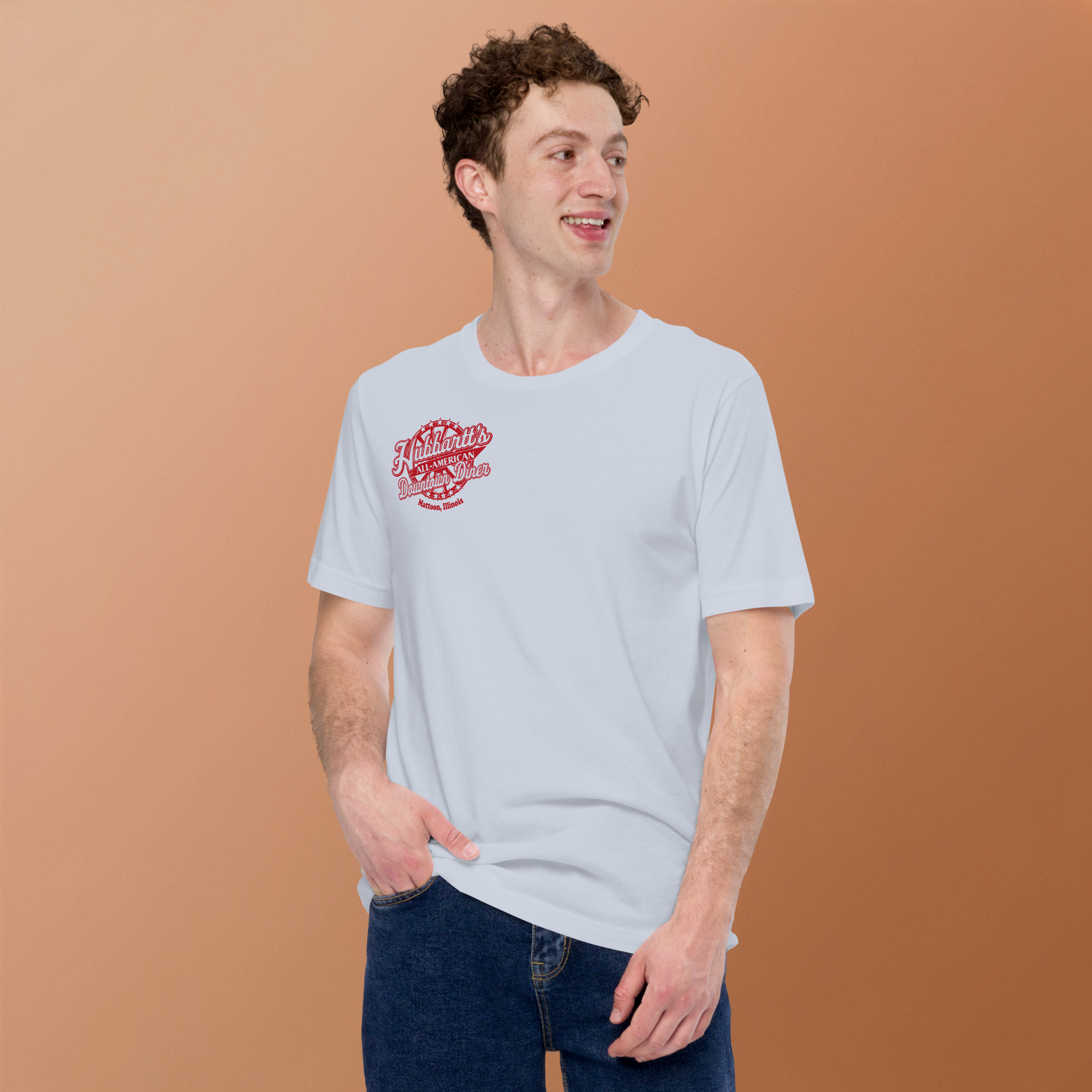 Unisex Staple T-Shirt - 12 Colors, 9 Sizes, Red Front & Back Logo - From Hubbartt's Downtown Diner at the Monarch Shoppe