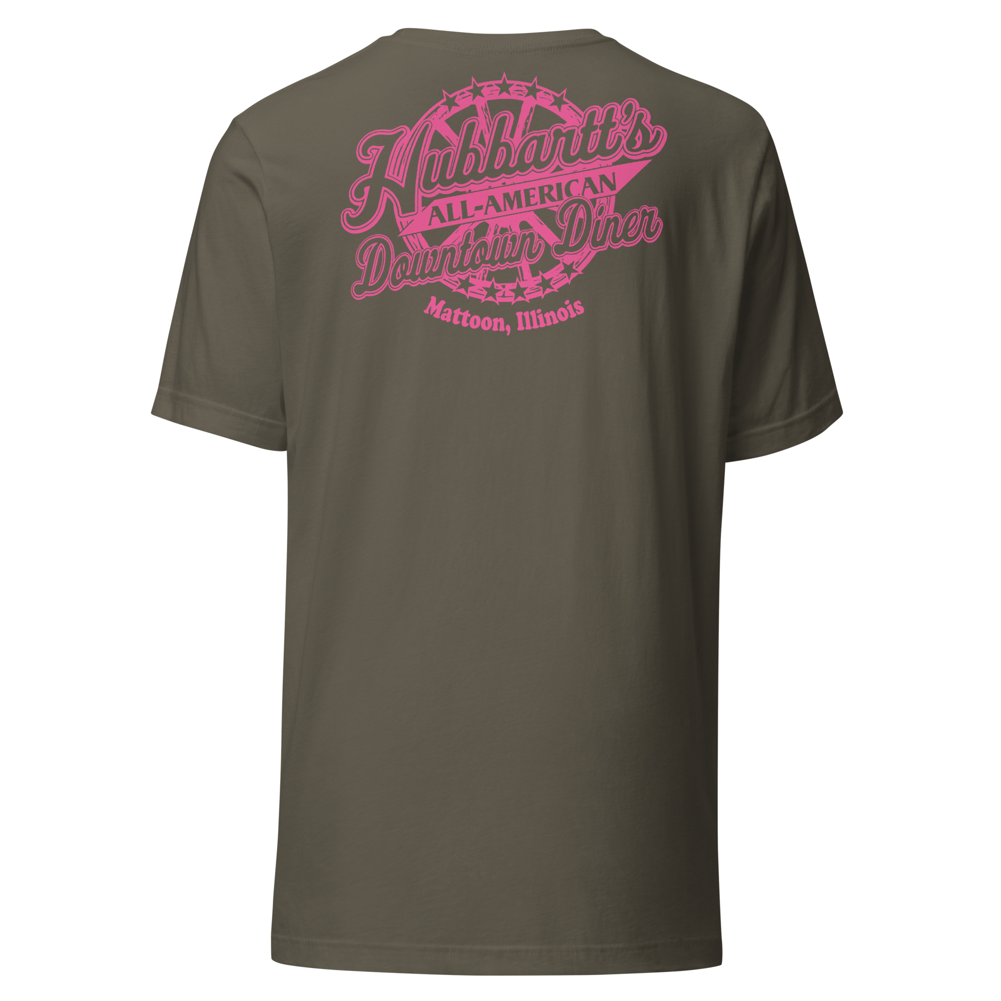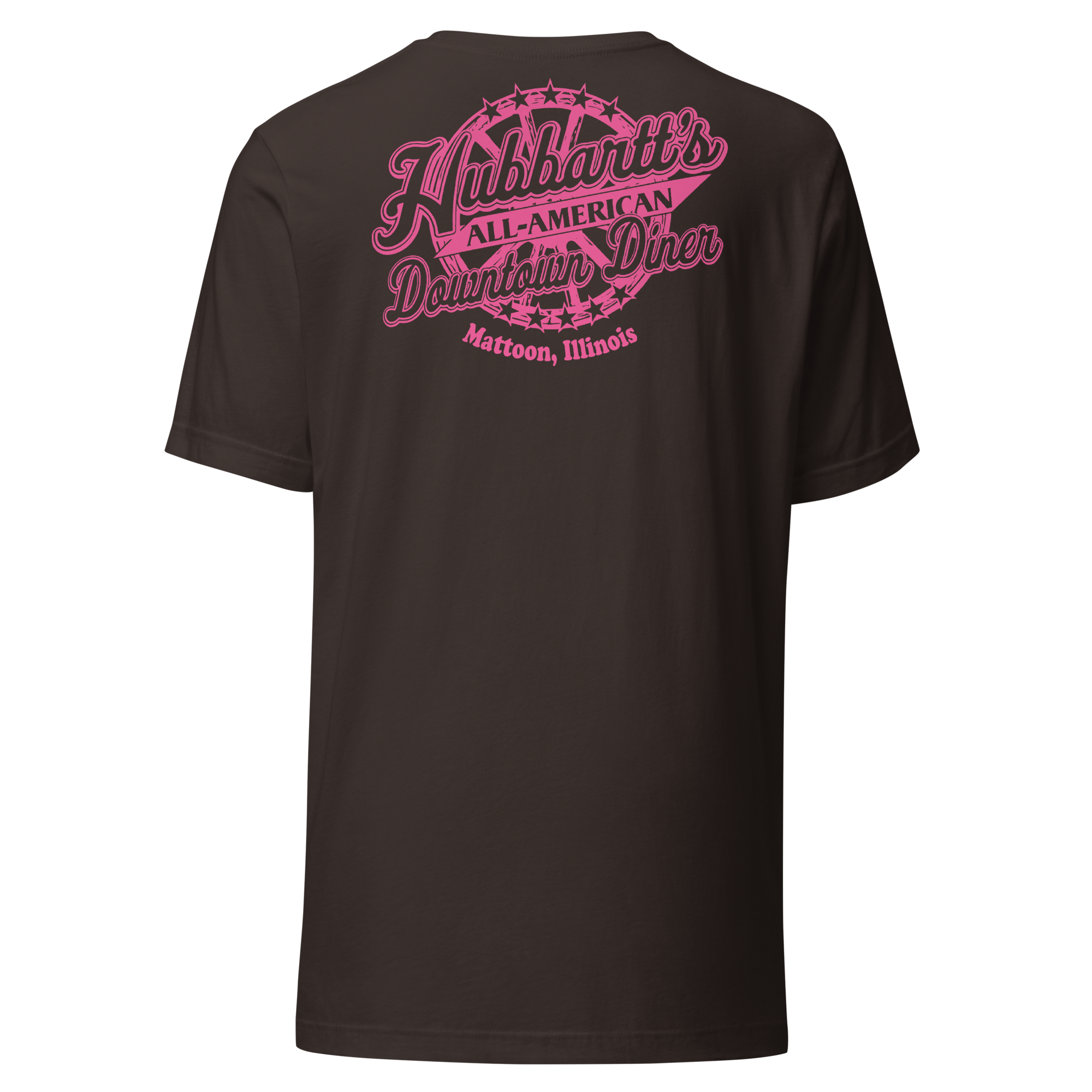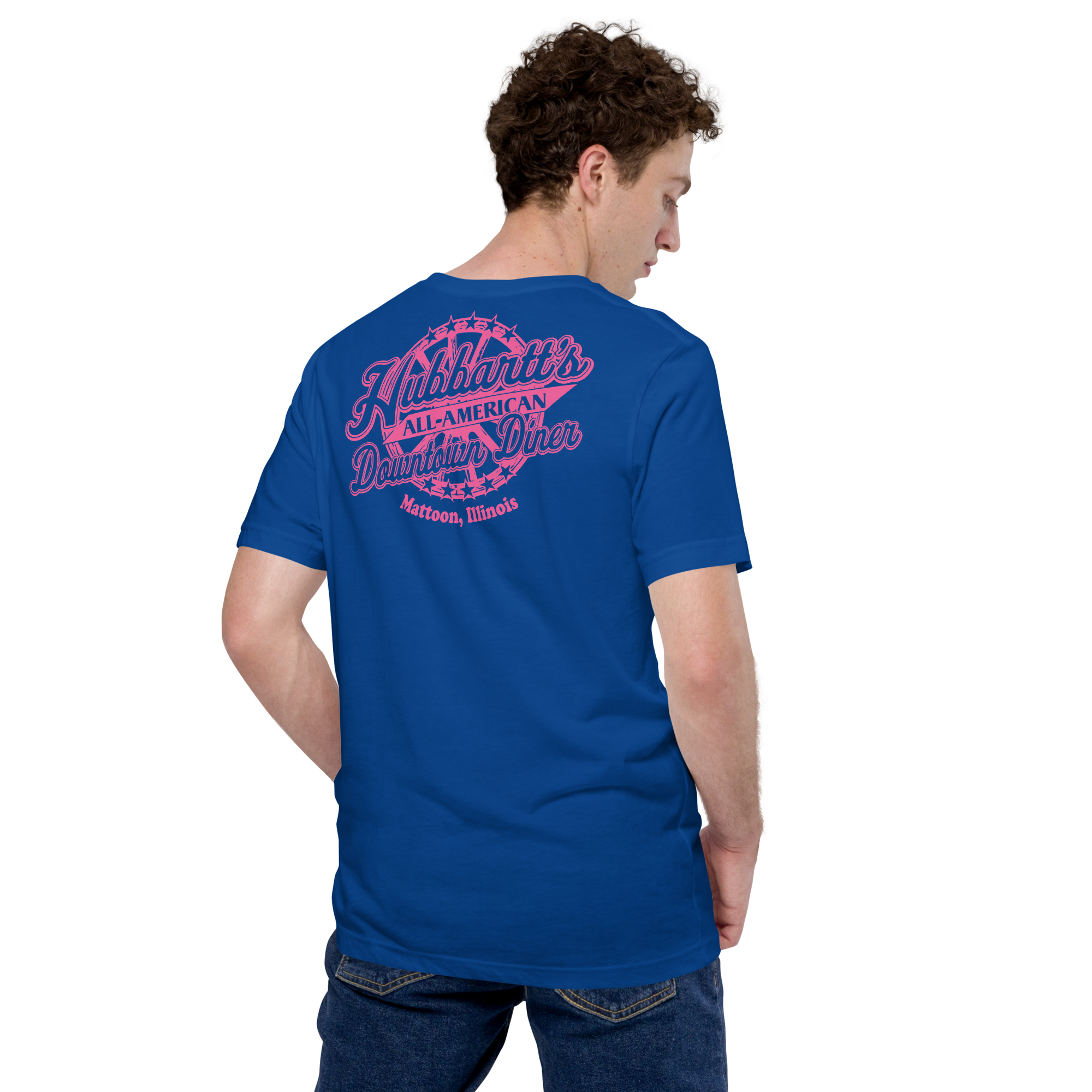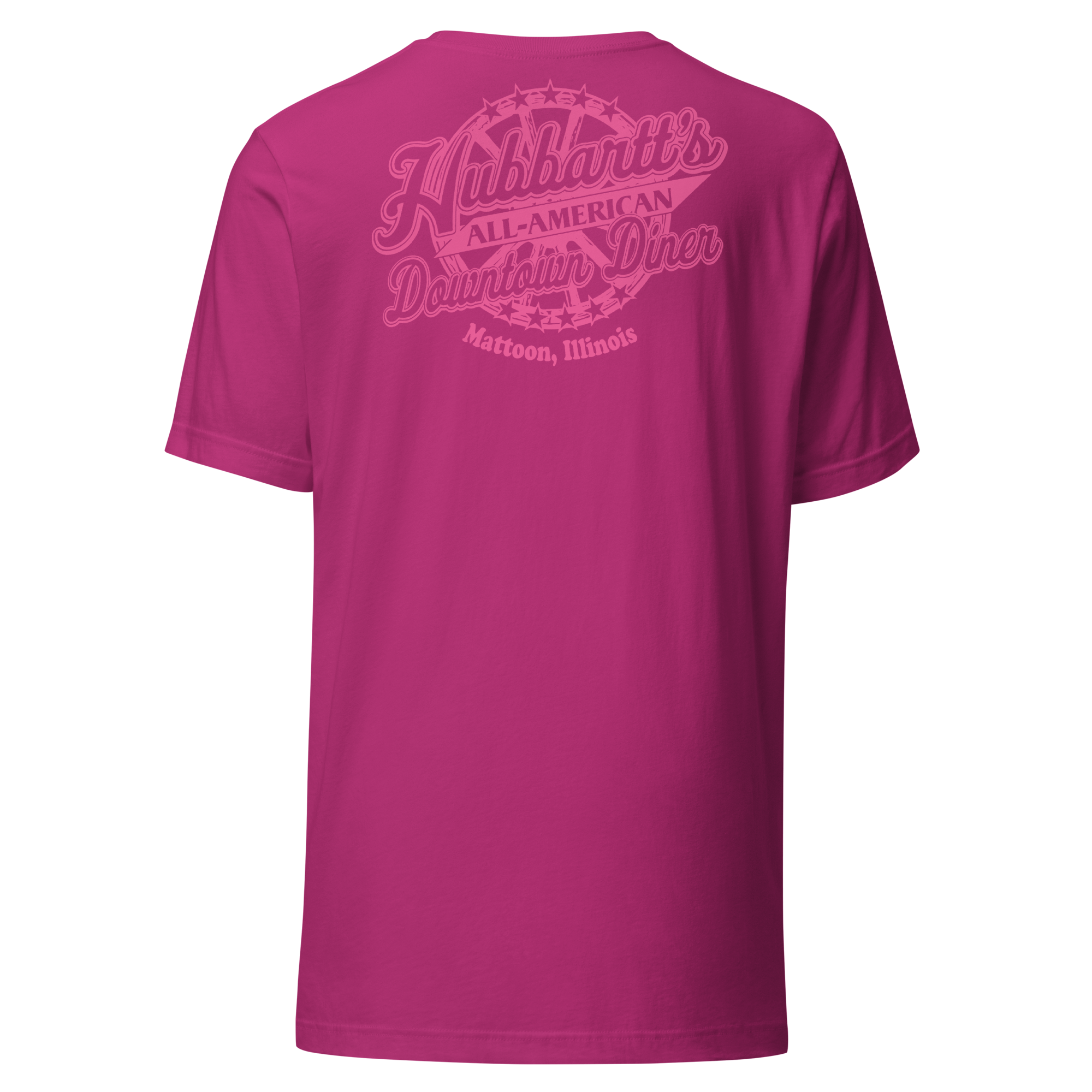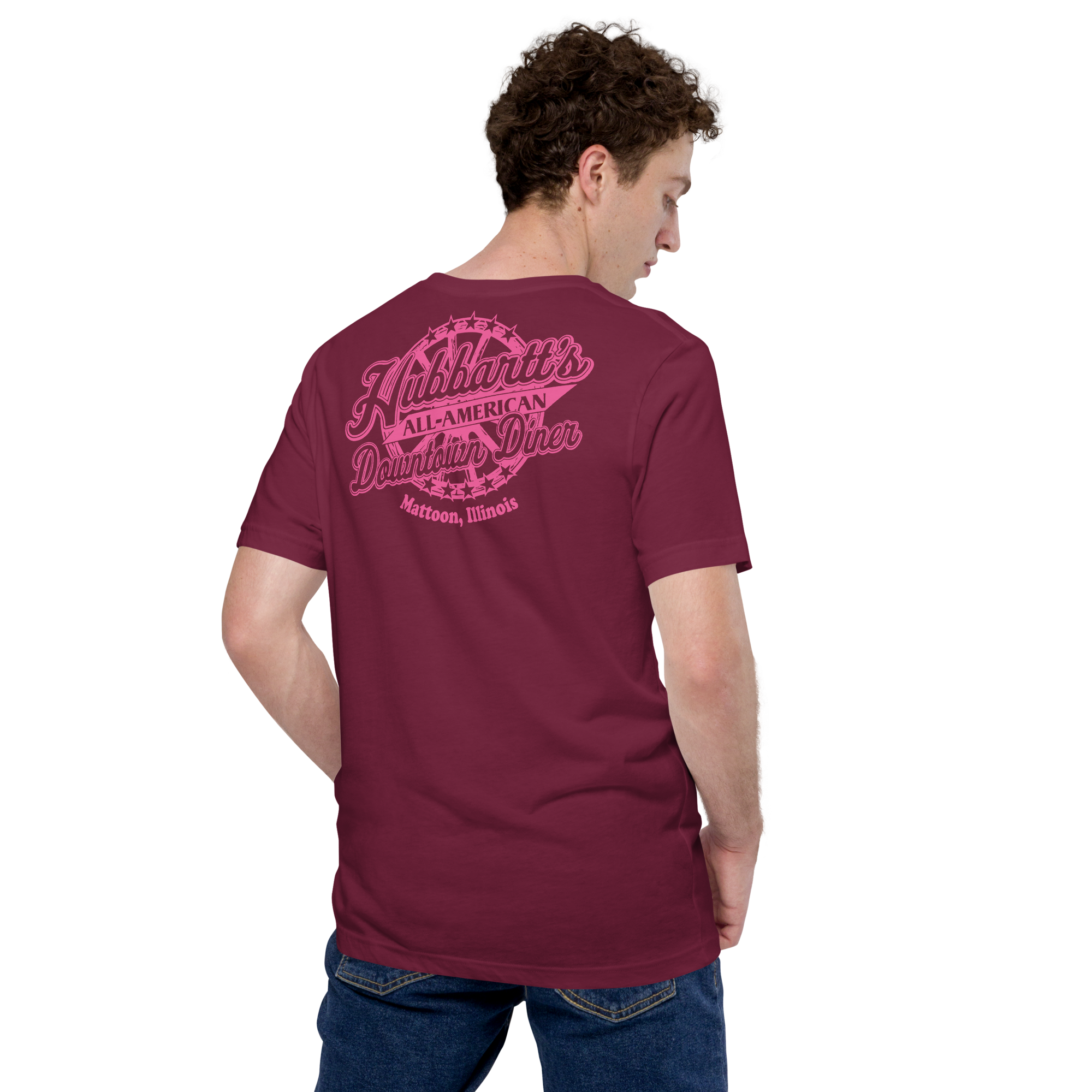 Unisex Staple T-Shirt - 13 Colors, 9 Sizes, Pink Front & Back Logo - From Hubbartt's Downtown Diner at the Monarch Shoppe