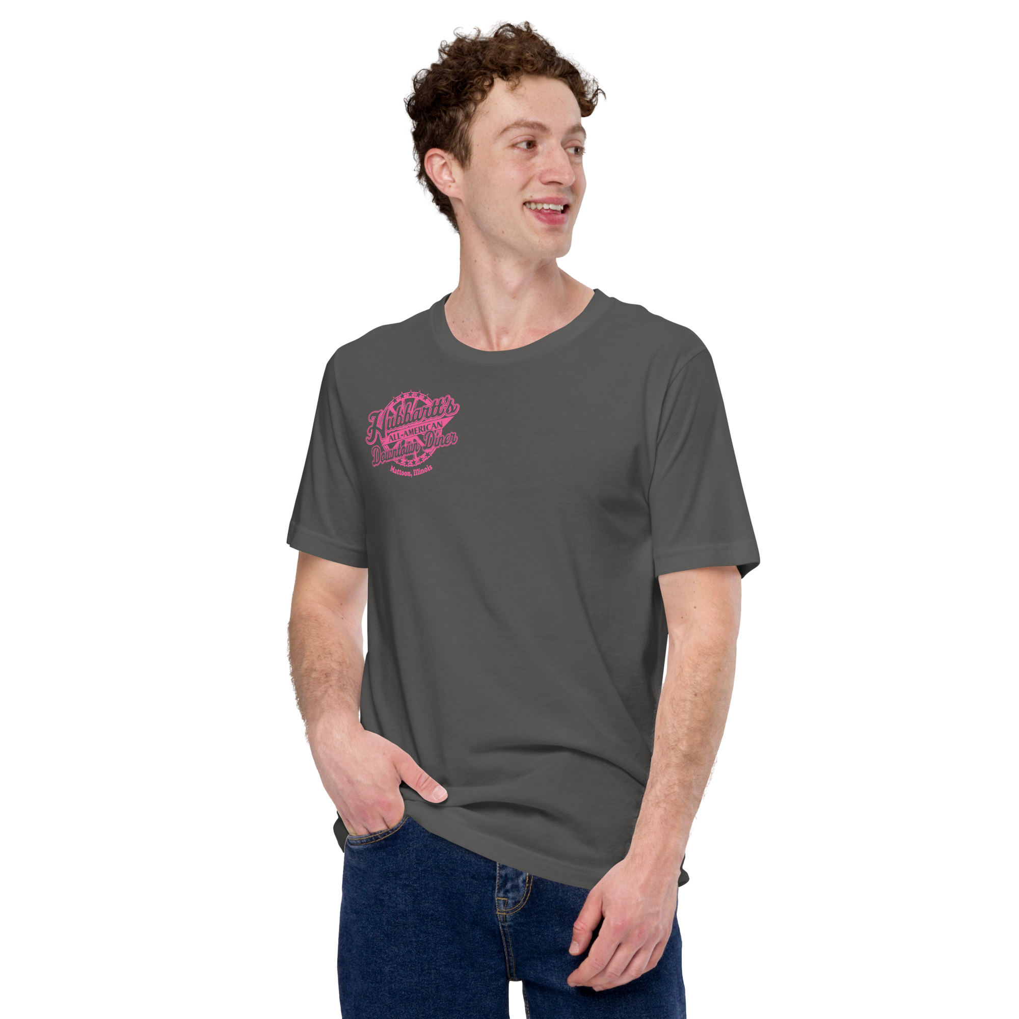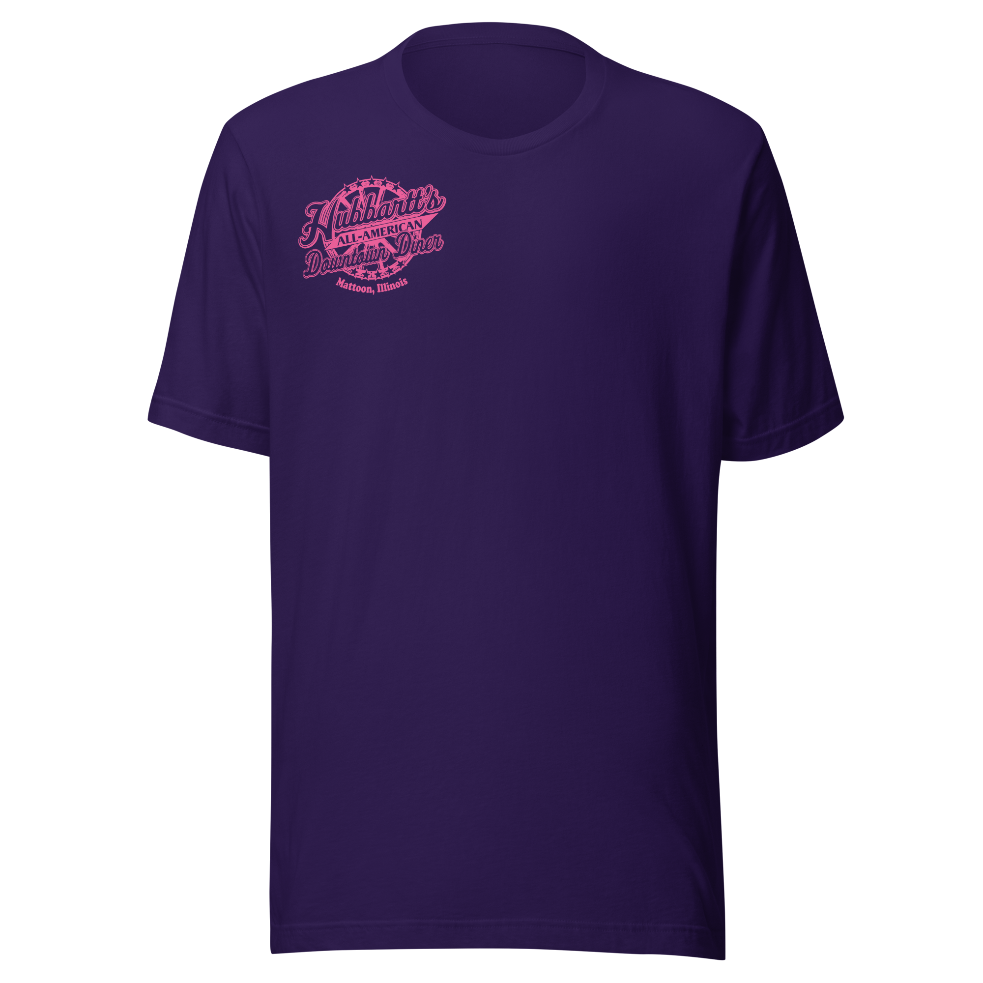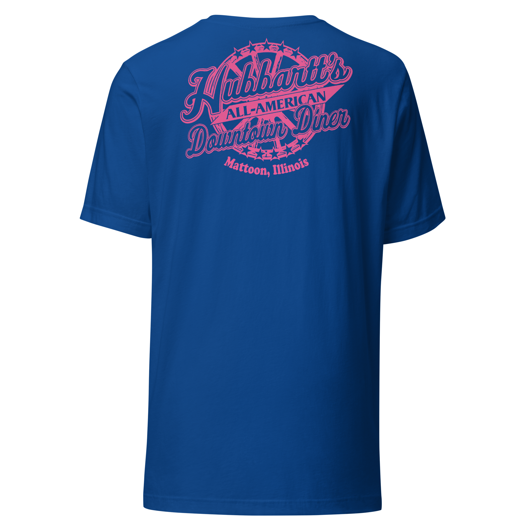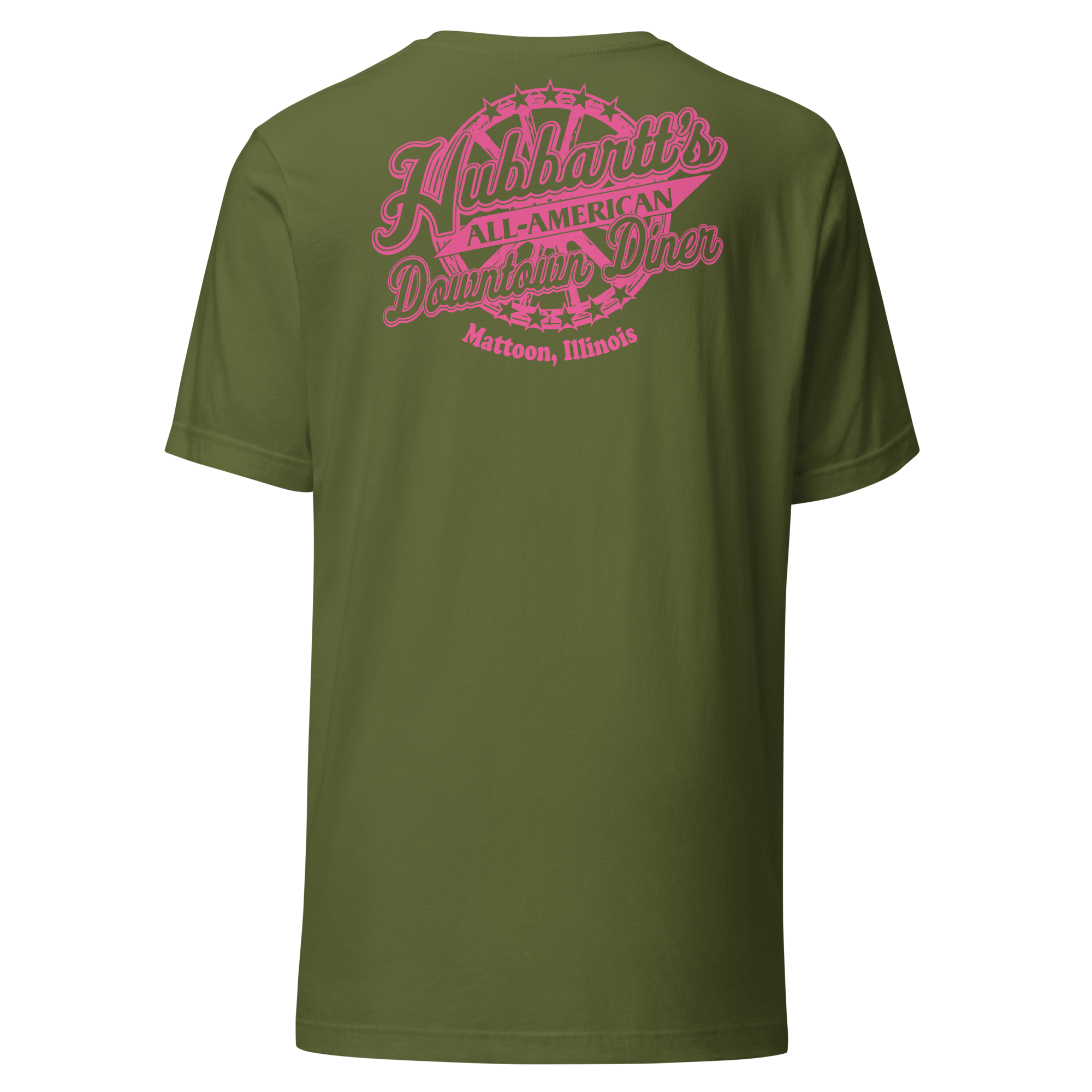 Unisex Staple T-Shirt - 13 Colors, 9 Sizes, Pink Front & Back Logo - From Hubbartt's Downtown Diner at the Monarch Shoppe