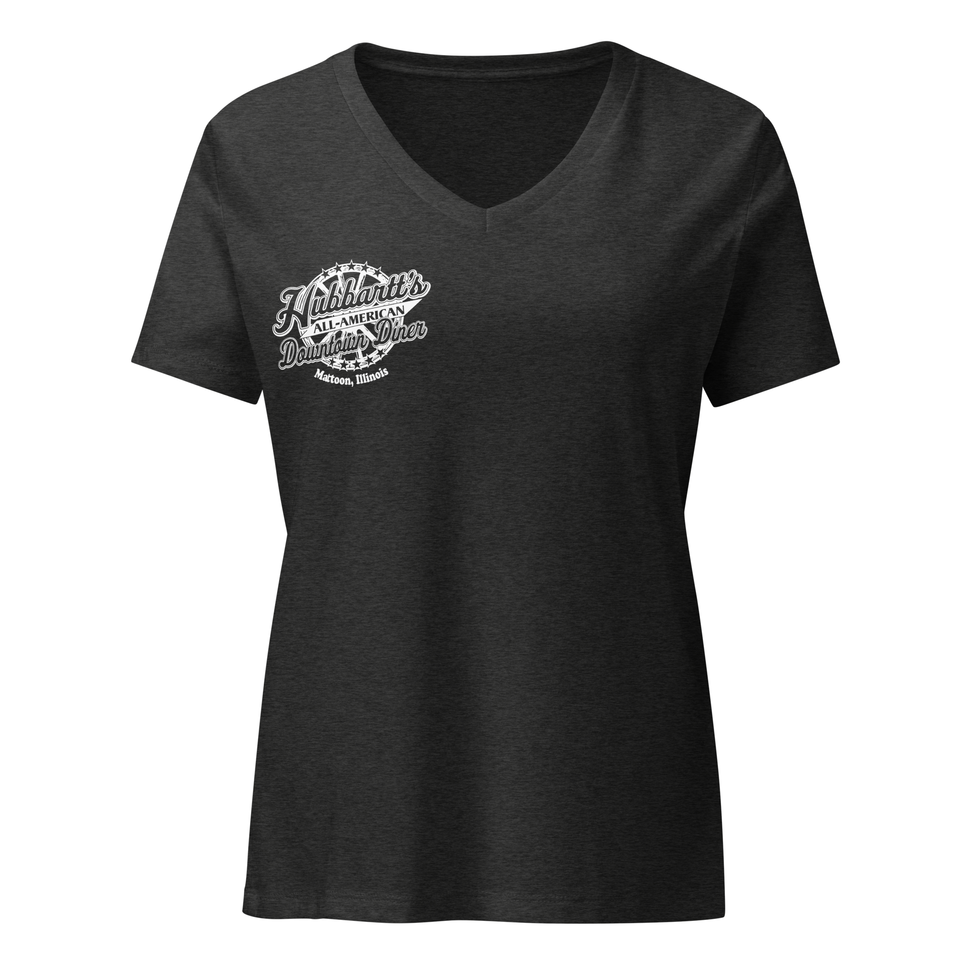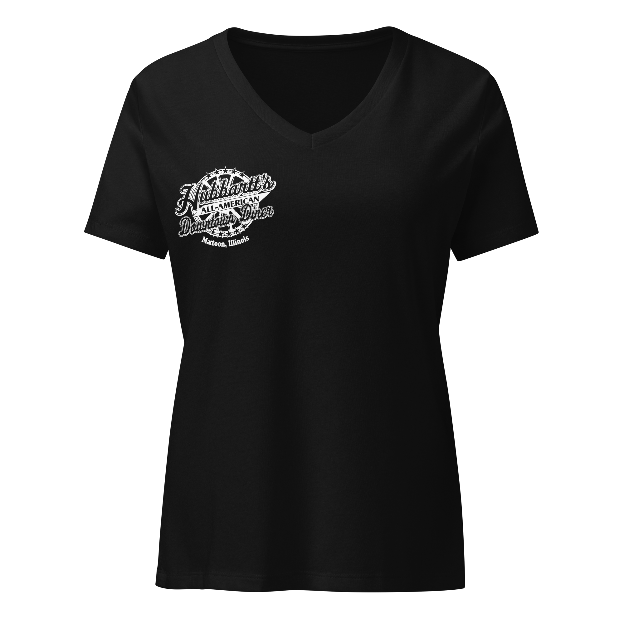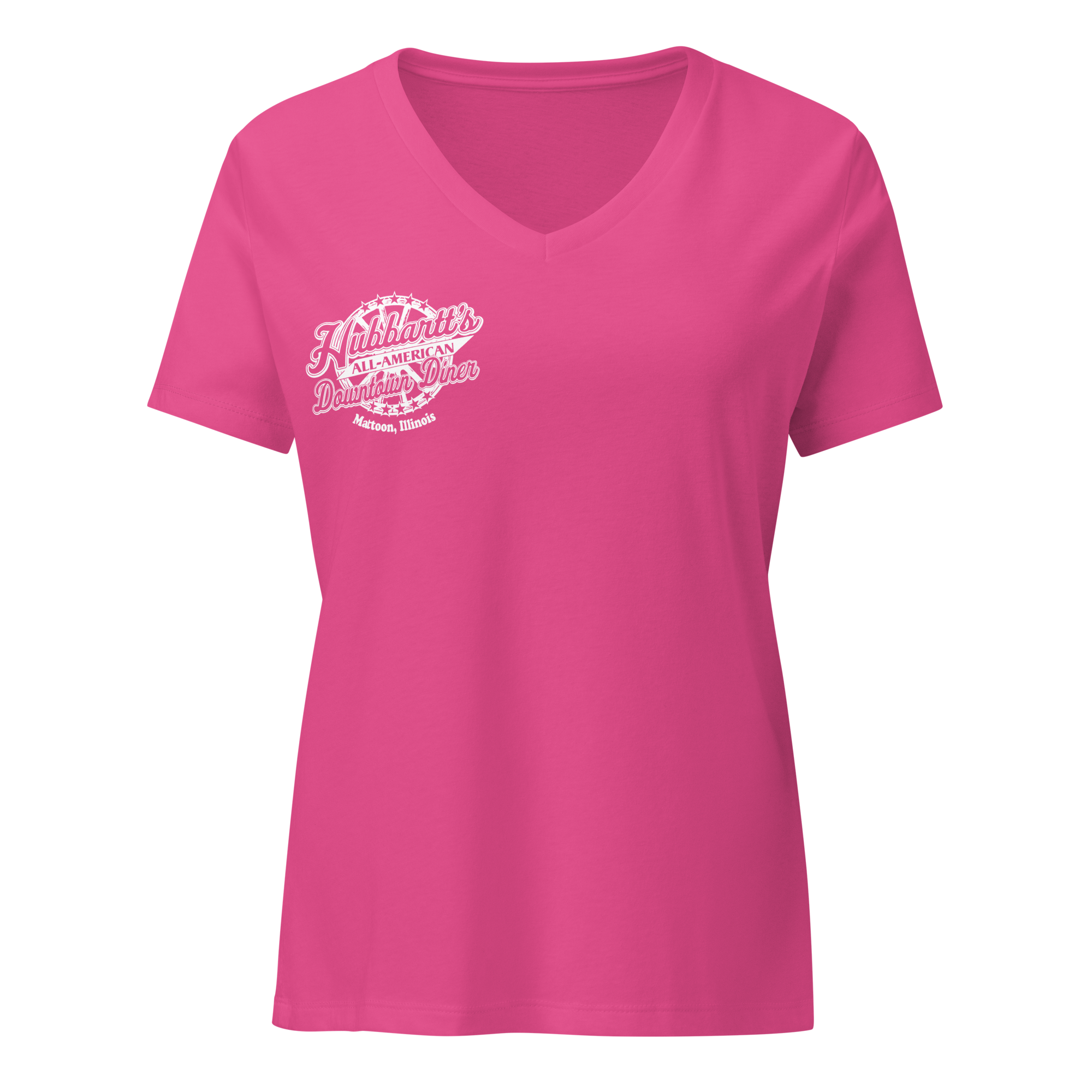 Women’s Relaxed V-Neck T-Shirt - 7 Colors, 5 Sizes, White Front & Back Logo - From Hubbartt's Downtown Diner at the Monarch Shoppe