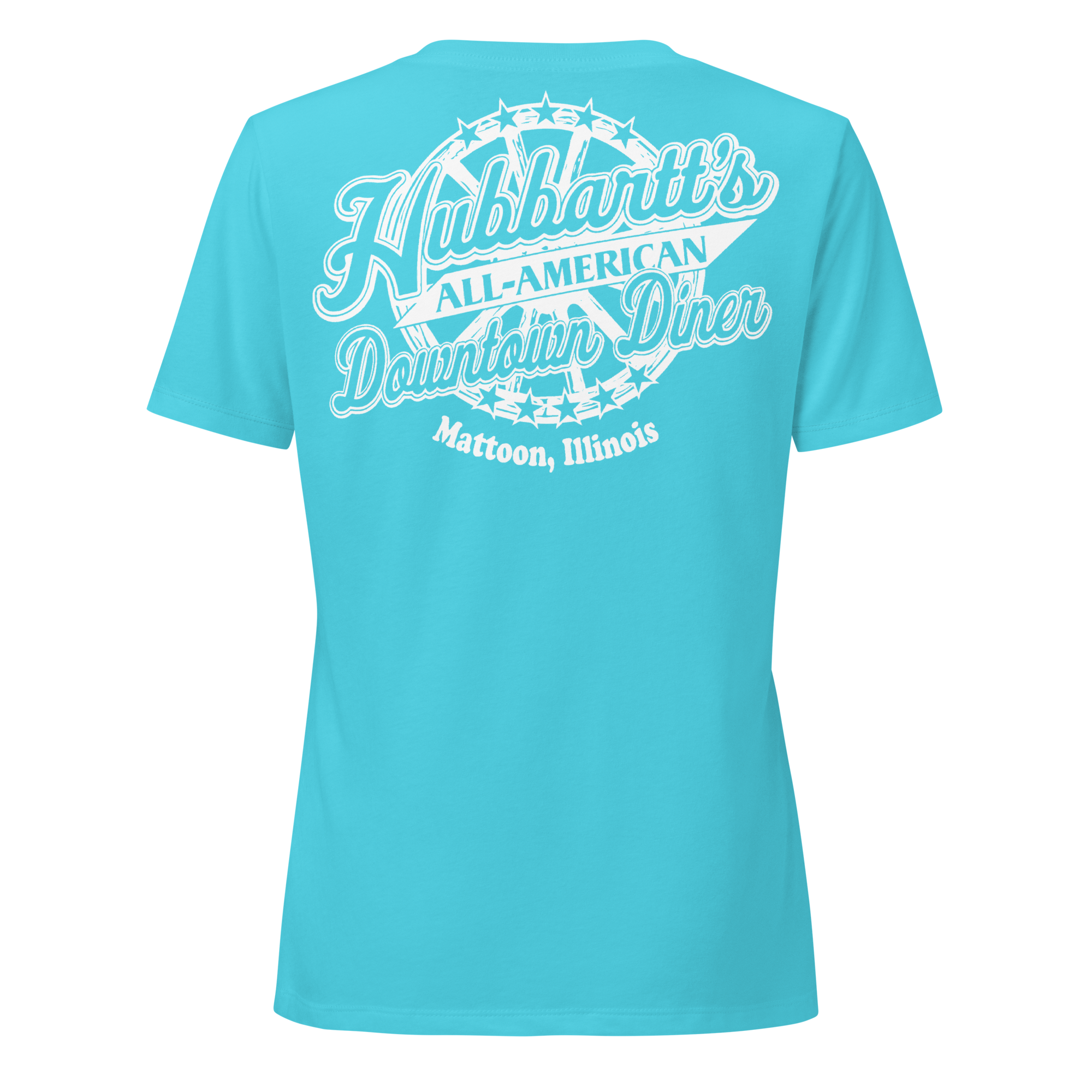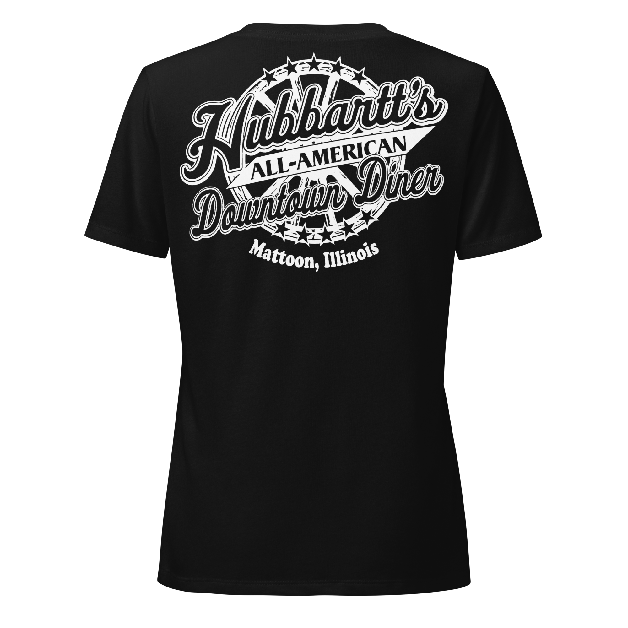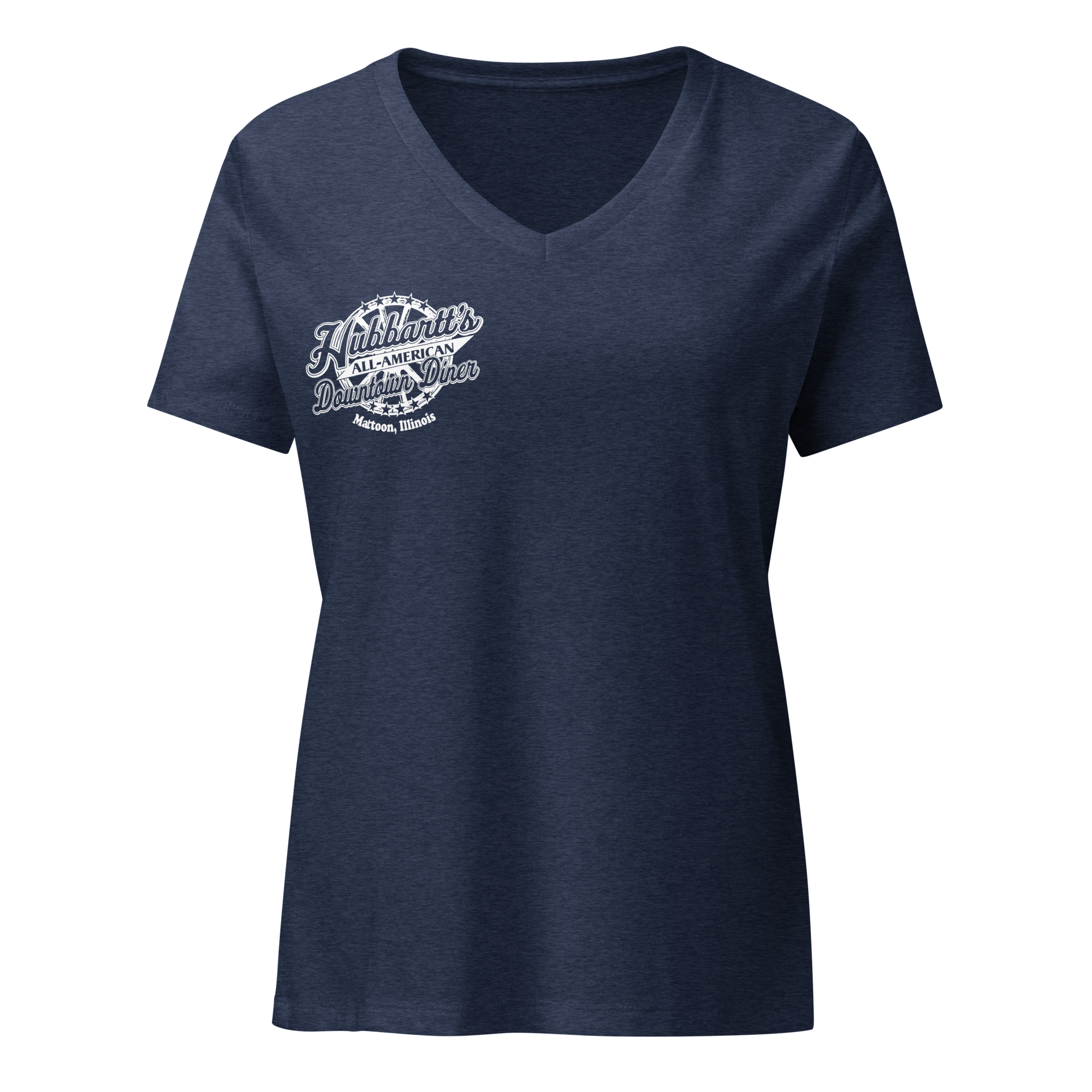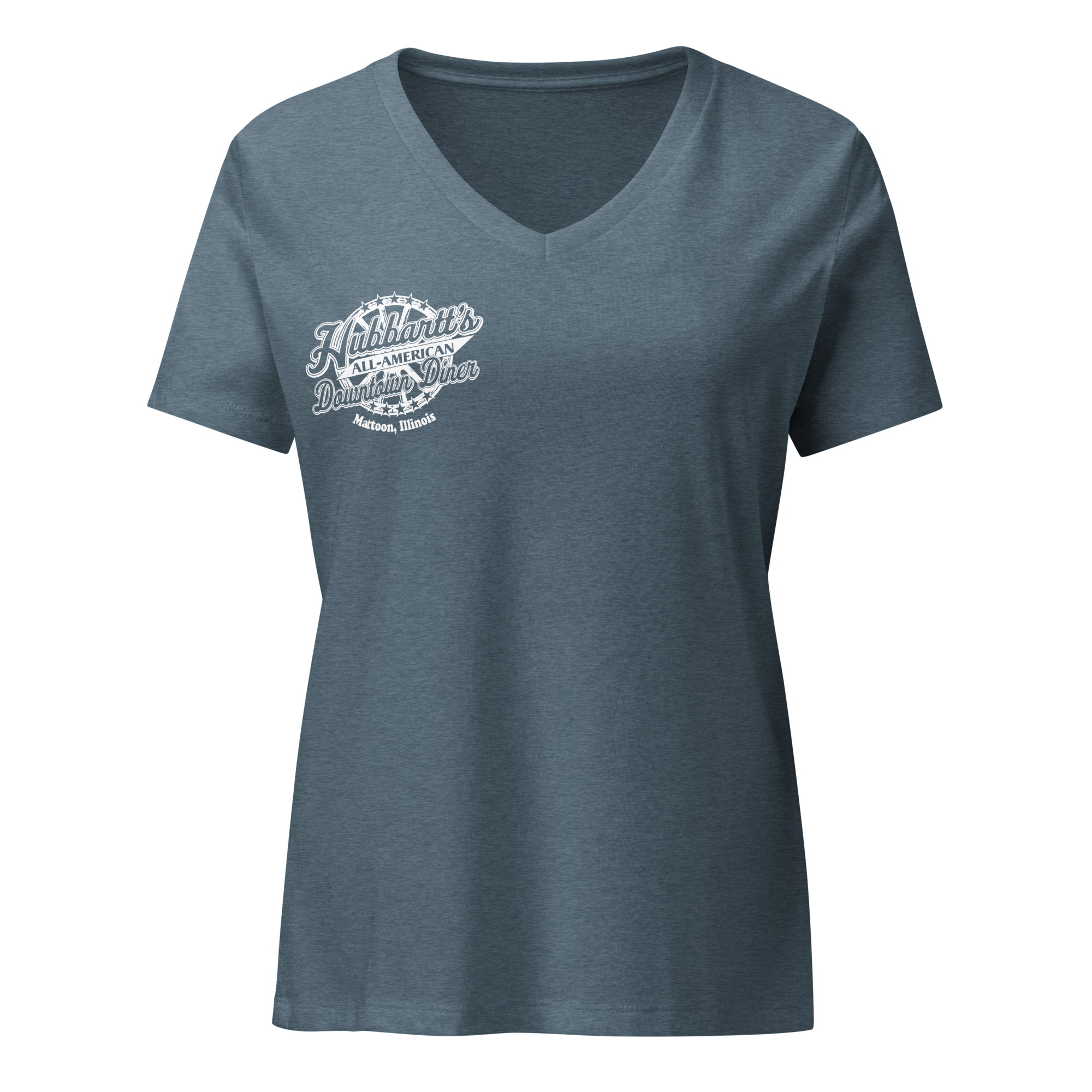 Women’s Relaxed V-Neck T-Shirt - 7 Colors, 5 Sizes, White Front & Back Logo - From Hubbartt's Downtown Diner at the Monarch Shoppe